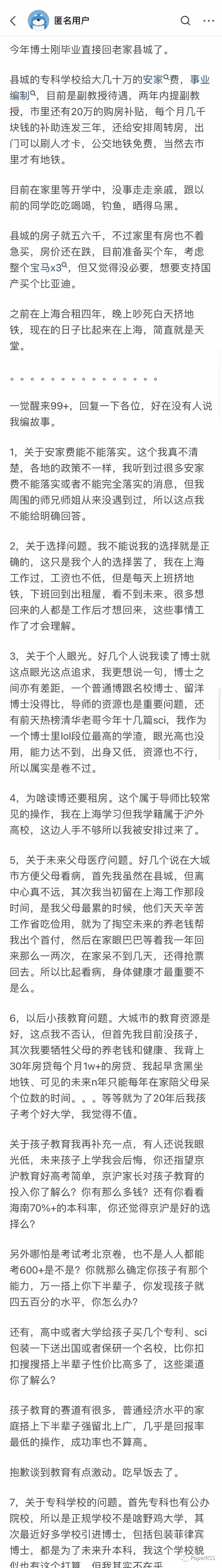 今年博士刚毕业直接回老家县城了。县城的专科学校给大几十万的安家费,事业编制,目前是副教授待遇,两年内提副教授,市里还有20万的购房补贴,每个月几千块钱的补助连发三年,还给安排周转房,出门可以刷人才卡,公交地铁免费,当然去市里才有地铁。
