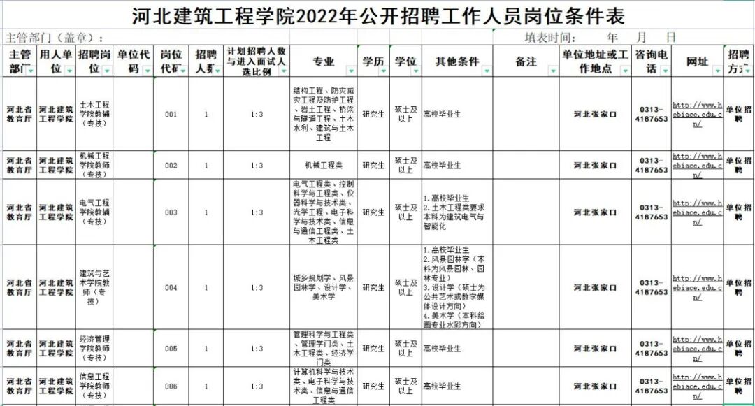 2022年该校拟公开招聘工作人员17名,其中专业技术岗位人员17名,具体招聘人数和岗位条件详见《河北建筑工程学院2022年公开招聘工作人员岗位条件表》(附件),其中专业参考教育部《授予博士、硕士学位和培养研究生的学科、专业目录》等设置。