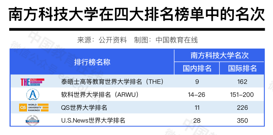 南科大也是同样的情况,四大榜单中,其在软科世界大学学术排名上最靠前,在国际排名位162位。而其在U.S. News排行榜上,国际排名到了300名之后,位列世界第350位。