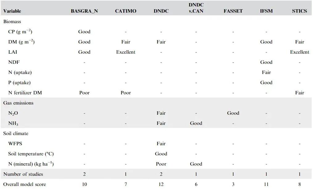 Note: Values represent the mean of scores given to each validation method where more than one was used to assess the variable. Validation data was extracted from five papers (Chatskikh et al.,2005; Congreves et al.,2016; He et al.,2020; Höglind et al.,2020; Jégo et al.,2015; Korhonen et al.,2018) from the initial literature search and summarised according to a system derived from Despotovic et al. (2016); He et al. (2020); and Moriasi et al. (2015).