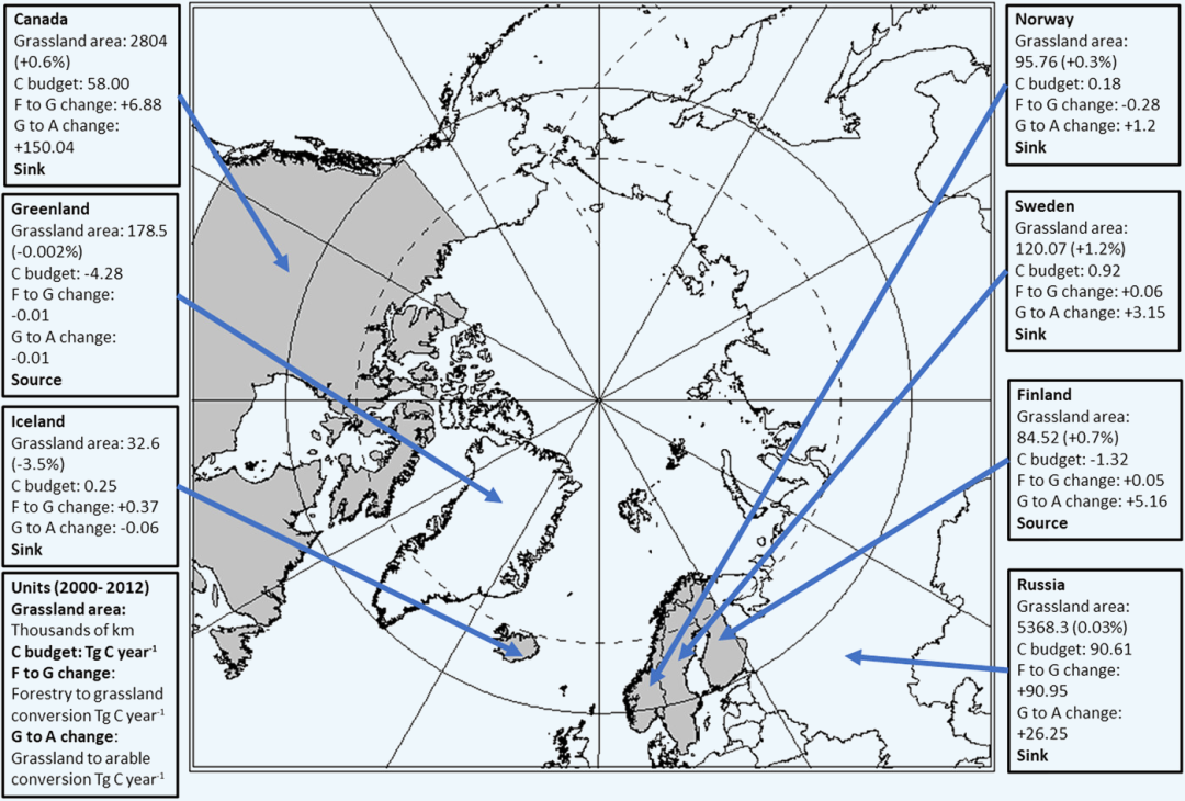 Figure 2:Regions examined in this study (greyed areas) and other boreal regions not included in this study (in white). Total grassland area (thousands of km) and percent change, carbon budget, and change associated with conversion from forestry to grassland (F to G change) and grassland to cropland (G to A change) in Tg C year−1, for the period 2000–2012 modelled using ORCHIDEE_GM (Chang et al., 2021), and a summary carbon ‘Sink’ or ‘Source’, in bold.