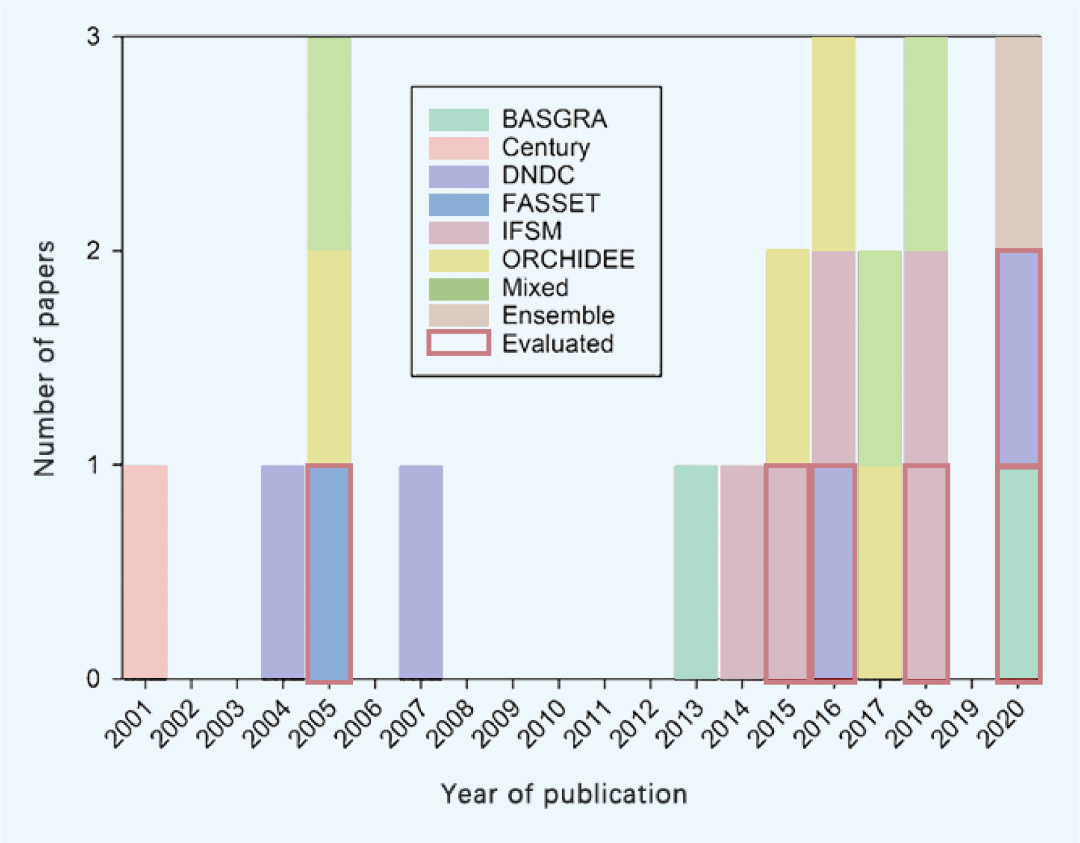 Figure 3:Number and type of model used in boreal modelling studies by year. Ensemble and mixed model approaches incorporate various models, but these approaches are judged sufficiently different form single model methods to be classed as models in their own right. Red highlighted papers contain model evaluations.