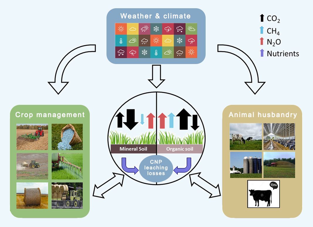Figure 1:Interactions affecting soil/atmospheric fluxes of GHG's (coloured arrows) in agriculture in mineral and organic soils (central circle), including: climate inputs (blue box), crop management including sowing, fertilising, harvest, spraying, baling and transport (green box), animal husbandry including grazing, housing, feed, manure management and GHG emissions, both enteric and from subsequent manure (brown box). White arrows indicate interactions between compartments.