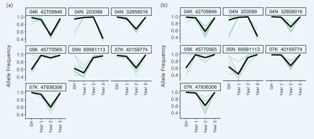 Figure 1: Reference allele frequencies of single-SNP outlier windows in DNA pools collected from half-sib families in a greenhouse (GH) and in the first year, the second year, or the third year of sward establishment. Families are derived from either the Liberty cultivar (a), or diverse Lowland populations (b). Each gray line indicates a family and includes all 26 families used in the analysis (18 within Liberty and 8 within Lowland). Black lines indicate the mean allele frequency of all families within the breeding population.