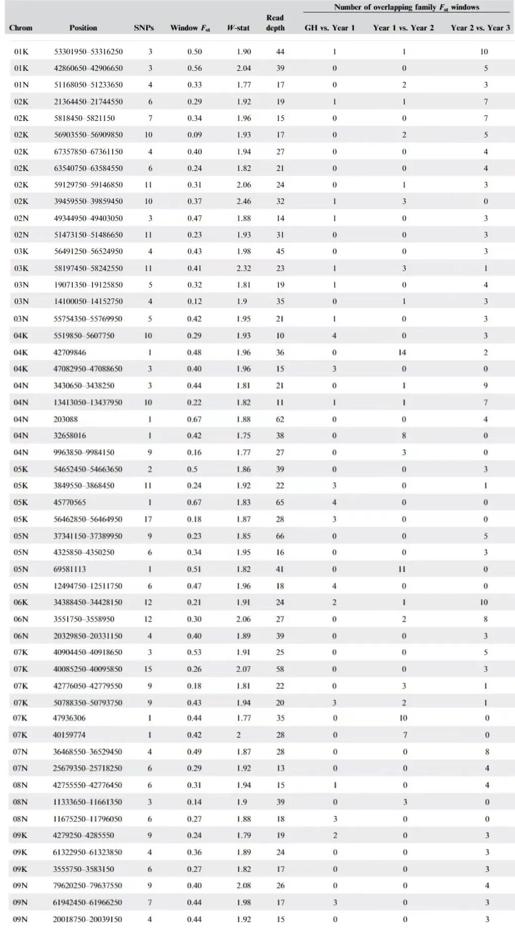 Note: Reported window positions are the narrowest band of markers which maximize the number of overlapping windows. Window Fst, W-statistics, and read depths are the mean values for all significant families within overlapping windows.