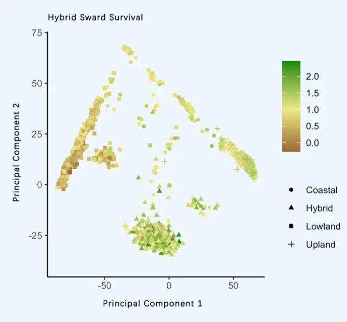 Figure 3: Principal components generated from marker data (m = 35 478) from the FLOMAS switchgrass trial containing four breeding groups. Point colors indicate genomically estimated breeding values for establishment survival based on training data from the hybrid breeding group. Units for sward survival were arbitrarily assigned scores (greenhouse samples = 0, Year 1 sward samples = 1, Year 2 sward samples = 2, Year 3 sward samples = 3).
