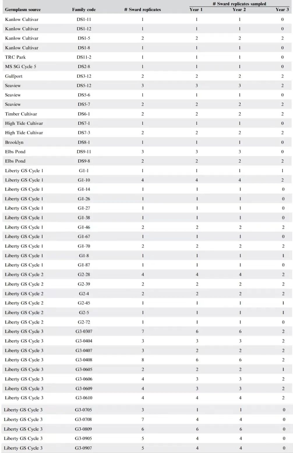 Note: Families from the same germplasm source were collected from a common and isolated cross-pollination block. Samples indicate the number of DNA pools sequenced for each stage. Unequal sample numbers are due to the unbalanced experimental design and reduced sampling effort during Year 3.