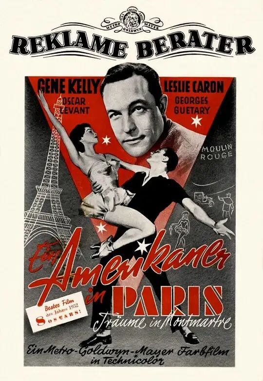 影片就如他的片名一样,表现的是美国人眼中的巴黎。作为战后歌舞片复兴的代表,该片精彩华丽,还有简单到不能再简单的剧情,以及优美的音乐、精湛的舞蹈,这些都让歌舞片成为战后抚慰人心的主要电影品种。男主角则是与阿斯泰尔齐名的好莱坞歌舞片巨星金·凯利,他更为世人熟知的是其自导自演的《雨中曲》。