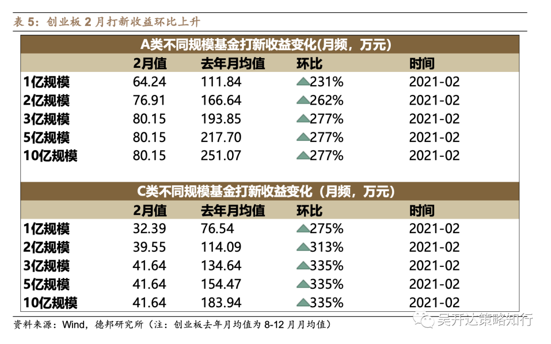 2021年2月科创板打新收益,小规模基金环比上升,大规模基金环比下降;创业板打新收益环比上升。
