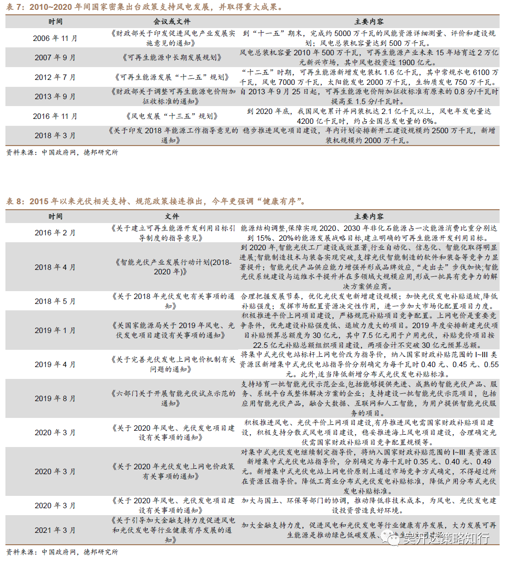 从国内风电行业发展路径来看,国家支持新能源行业政策力度强,执行效果卓著,未来光伏行业有望在风电行业发展经验基础上稳健发展。2010年以来风电行业发展被写进“五年计划“系列政策,中央政府对此的重视程度可见一斑,从结果来看风电发电量占比也从无到有稳步提升至2020年的5%;光伏行业相关发展政策自2015年以来密集推出,太阳能发电占比也伴随着逐步提升至2020年2%,今年以来国家在政策层面越发强调行业发展的“健康有序”,在风电10年发展的经验基础上,国内光伏行业有望实现可持续的稳健发展。