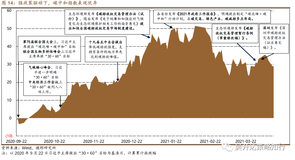 气候雄心,虽远必至。复盘自2020年9月22日(习近平主席在联合国大会上提出“30·60”目标)起碳中和指数累计涨跌幅,政策从粗到细、从中央到地方不断优化,持续驱动碳中和指数保持强势。在2020年9月末至2021年1月末期间,随着“碳达峰·碳中和”成为中央会议高频热词,碳中和指数稳步上涨,后随着气候雄心峰会习近平主席进一步明确“30· 60”具体目标,以及在中央经济工作会议上,“30·60”被列入八大重点工作之一,碳中和指数涨幅加速抬升,后续政策端进一步细化,生态环境部聚焦于碳交易制度建设,发布相关文件指引,碳中和指数实现累计涨幅近50%。2021年1月末至2月末期间,政策端加速由中央逐步传导至地方,多省份发布《2021年政府工作报告》,紧随中央提出制定“碳达峰·碳中和”行动计划,发展碳交易市场,碳中和指数高位继续上行,直到 2021年2月末,碳中和指数才开始降温,截至目前碳中和累计涨跌幅稳定在30%+,表现亮眼。后续随着2030年碳达峰行动方案出台,各部委制定目标与出台具体规划,各地出台地方碳达峰主要政策,行业开展碳达峰行动,扩大环保节能企业所得税优惠目录,推出碳减排支持工具等将对碳中和指数形成催化。
