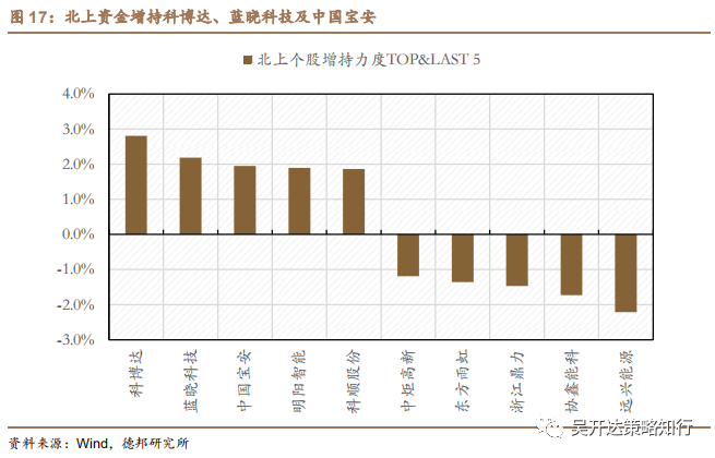 从个股上来看,增持前三名依次为科博达、蓝晓科技及中国宝安,前二增持力度均超2.0%,其中科博达已连续两期增持超2.5%;减持前三位为远兴能源、协鑫能科和浙江鼎力,其中远兴能源减持力度达2.21%。