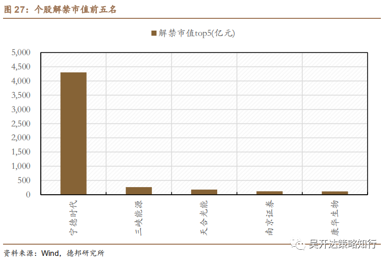 从个股来看,解禁前5名依次为宁德时代、三峡能源、天合光能、南京证券和康华生物,对应解禁市值分别为4305.57亿元、265.47亿元、178.90亿元、119.82亿元和113.06亿元;宁德时代在大幅解禁来临的情况下,并未出现大幅波动,市场承接力度尚可。