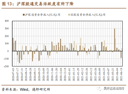 北上资金开始出现流出,资金交易活跃度有所下降。本期北上资金净流出20.74亿元,其中沪股通资金净流出65.75亿元,深股通资金净流入45.01亿元,较上期均有明显回落;本期北上资金交易活跃度较上期有所下降,北上资金整体呈流出趋势,达到近两个月低点。