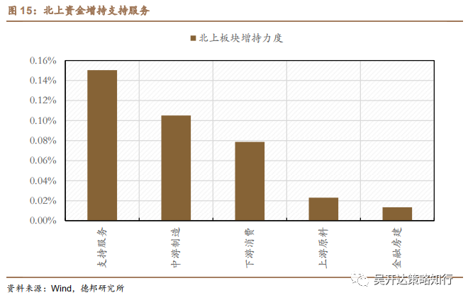 北上资金增持力度整体有所减弱,偏好支持服务和中游制造。本期除支持服务板块外,其他板块增持力度较上期均有所减弱。其中支持服务板块增持力度达0.15%,较上期有所提高;本期中游制造仍受青睐,增持力度为0.11%。