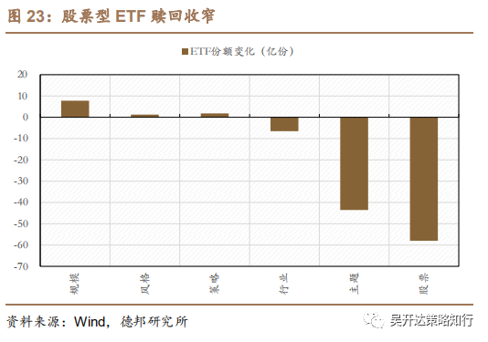 股票型ETF赎回收窄,上证50ETF获资金青睐;芯片ETF遭大额赎回。本期股票型ETF净赎回58亿份,较上期赎回收窄;主题类ETF净赎回规模最大,达43.56亿份。个券方面,本期上证50ETF获资金青睐,净申购达13.01亿份;其次为沪深券商ETF,净申购12.65亿份。芯片ETF(159995.SZ)和光伏ETF的净赎回规模较大,净赎回份额分别为21.99亿份和10.08亿份。