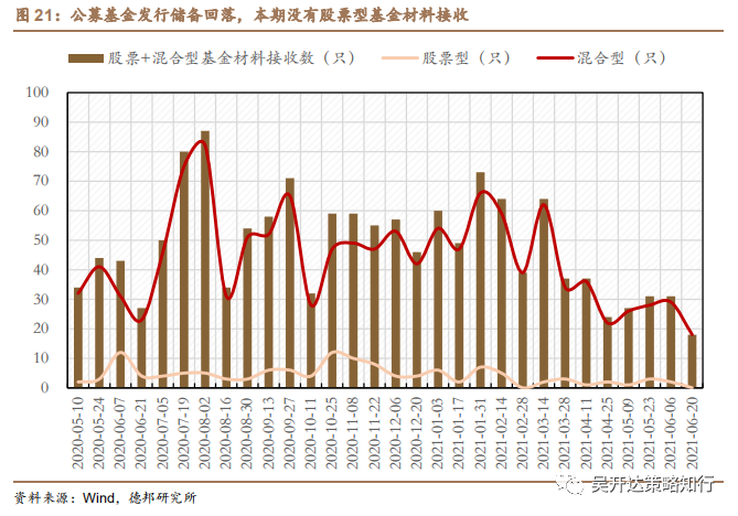 公募基金发行储备回落,发行类型以混合型为主。从基金储备来看,股票型和混合型基金材料接收总数在本期共有18只,较上期明显回落;本期没有股票型基金材料接收,股票型基金材料接收数维持较低水平,公募基金发行类型以混合型为主。