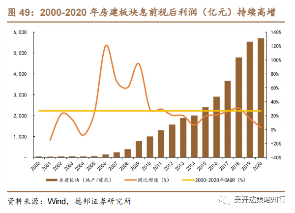 盈利持续高速增长,板块历史复合增速25.6%。房地产行业2000-2020年息前税后盈利CAGR 23.45%(板块整体CAGR 26.83%),2019年盈利规模达3038亿元,2020年受疫情、经济下行压力增加、融资环境收紧等因素影响,盈利规模降至2912亿元(-4.14%)。此外,建筑行业扩张性资本投入跟随下游地产行业,呈持续扩张态势,行业△NWC规模有所增加,但运营效率持续提升,行业2000-2020年利润规模CAGR 35.80%,2020年维持正向增长达2796亿元(+11.79%)。