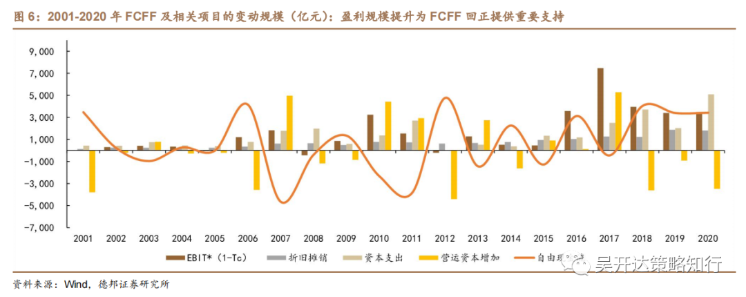 分拆来看,息税前利润2000-2020年CAGR 20.91%,规模由2000年的761亿元提升至2020年3.39万亿元,增长43.6倍;折旧摊销 2000-2020年 CAGR 19.59%,2000年430亿元,2020年增长34.8倍达到1.54万亿元;资本支出2000-2020年 CAGR19.61%,规模由813亿元(2000年)增长至2.92万亿元(2020年),增长34.9倍;净营运资本增加额波动较大,2020年为1853亿元,2000-2020年均2745亿元。