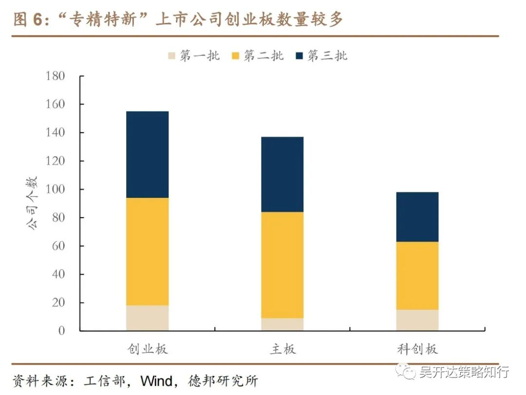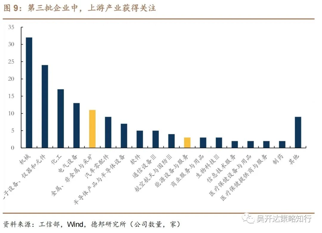 “专精特新”概念渐广义化,最新批次上游原料行业所占比重提升。从三批企业的细分行业来看,三年内“专精特新”公司细分行业以化工、机械及电气设备为主(分类标准参考Wind三级行业分类),同时各批企业行业分布也略有变动,与前批次相比,第二批企业中医药生物相关概念公司所占比重显著提高,其中制药行业数量及占比均大幅提高;第三批企业中上游材料及能源设备公司开始获得关注。