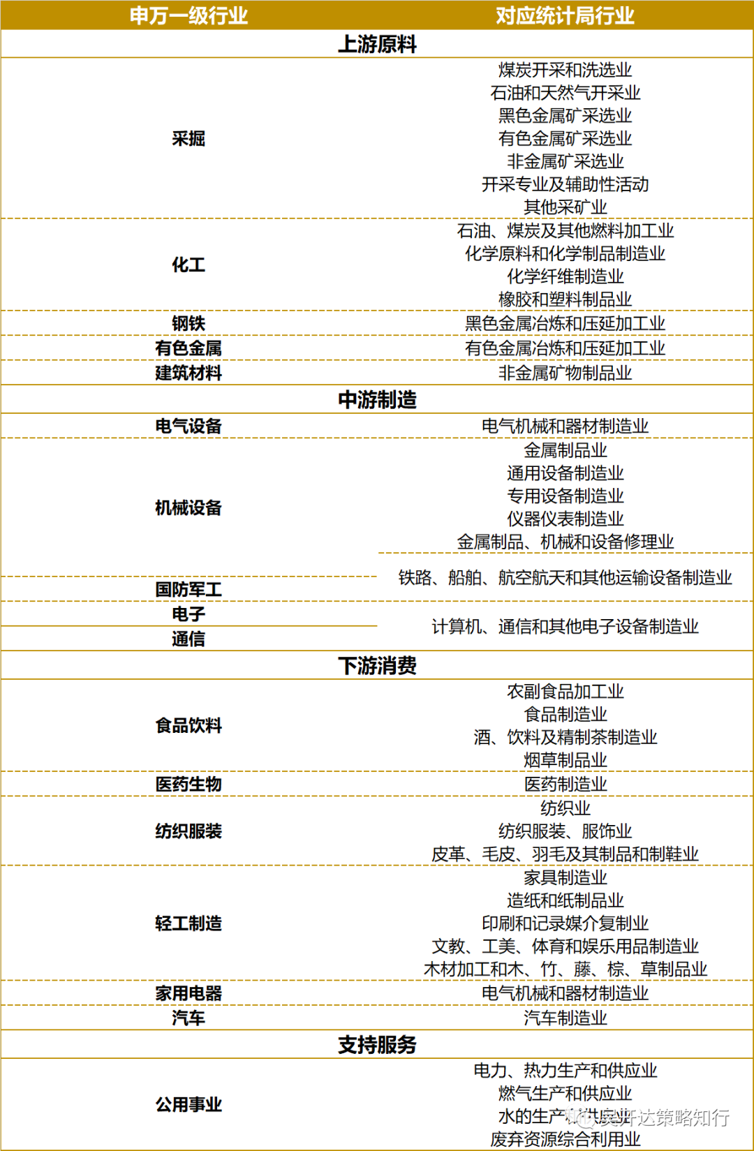 上游原料包括采掘、化工、钢铁、有色金属及建筑材料,是其他四大板块的成本端;中游制造包括电气设备、机械设备、电子、通信、军工,主要为产业链中间品及消费属性较弱的制造业;下游消费包括由农林牧渔、食品饮料、医药生物及纺织服装构成的必选消费,及汽车、家用电器、轻工制造、休闲服务、传媒构成的可选消费;金融房建包括非银金融、银行、房地产及建筑装饰,地产基建与大金融紧密相关;支持服务包括公用事业、交通运输、商业贸易及计算机,是经济系统的“润滑剂”和“晴雨表”。上游原料与中游制造、金融房建直接相关度较高。上游采掘作为基础支持化工、钢铁、有色金属及建筑材料四类原材料生产,金融房建中房地产与建筑装饰产生对化工中建筑地产链(MDI、PVC、钛白粉等)、钢铁中螺纹钢及建筑材料需求,中游制造对多条路径化工、钢铁中冷热轧、建筑材料中玻璃玻纤及有色金属构成需求。中游制造与其余四大板块均有较强关联。板块内五个行业相互交叉,同时也构成供需关系。板块外任何生产经营活动都离不开电气、机械设备,信息化大数据时代电子、通信产品存在各个角落,军工主要服务于国防,是经济社会正常运行的基础。下游消费生产端受到上游原料及中游制造支持,需求端部分受金融房建影响。必选消费部分农林牧渔是基础,为细分板块内食品饮料、医药生物(主要是中药,西药原料来自化工)、纺织服装(棉花等,其余原料来自化工)及外部轻工制造(木浆等)提供原料。可选消费部分家用电器成本端主要由上游板块及中游电子构成,需求端同轻工制造中家具赛道一同与房地产周期相关,汽车成本端主要为钢铁。休闲服务及传媒同属于精神娱乐消费,传媒的发展离不开电子、通信的技术创新。金融房建与国家货币财政政策紧密相关,也为上中下游创造了部分需求。房地产与建筑工程开工创造工程设备需求,同时房地产竣工与装修装饰也带来了家具家电消费。支持服务如字面意思服务于其他行业的生产经营。公用事业中电力&环保、交通运输、商业贸易的服务职能均较好理解,值得一提的是计算机行业,其软件、云服务及产业互联网也是帮助客户更好的运作业务。3. 应用方法:自上而下与自下而上两条路径的交叉验证自上而下来看,我们将统计局行业匹配对应至申万一级行业,从而利用官方工业增加值指标变化输出对应行业边际景气方向。图2:申万一级行业与统计局行业对应关系