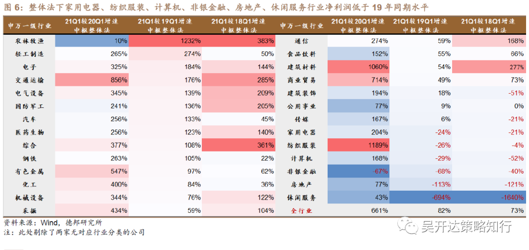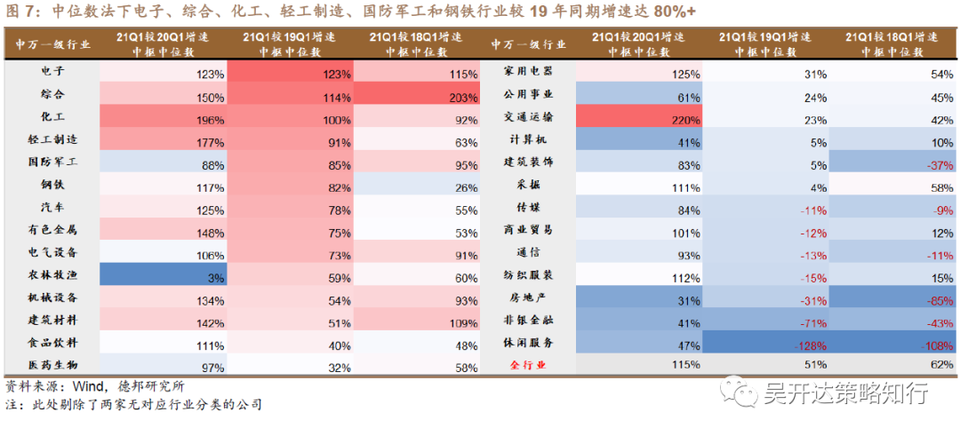 考虑到20Q1存在低基数效应,因此我们在传统预喜率指标基础上,进一步 计算21Q1 净利润恢复至2019 年同期公司占比,以观察披露业绩预告公司一季度业绩恢复情况。披露2021年一季报业绩预告公司整体预喜率达77%。从具体业绩预告类型来看:业绩预增公司共有640家,在所有类型中占比(48%)最高;业绩扭亏共309家,占比23%;业绩略增共69家,占比约5%;业绩续盈共7家,占比1%;业绩续亏、预减、首亏和略减共305家,占比约23%。我们进一步拆分业绩预告类型为预减、略减、首亏、续亏公司行业构成,其中计算机占比最高。占比前五行业分别为计算机(12%)、房地产(8%)、机械设备(8%)、化工(7%)、电气设备(6%),其中机械设备、化工、电气设备三大高景气行业内部公司质地显著分化;占比后五分别为钢铁(0%)、综合(1%)、食品饮料(1%)、采掘(1%)、交通运输(1%)。样本内披露业绩预告公司中已恢复至19年同期占比达68%,近七成公司从疫情影响中恢复良好。恢复率超过80%行业中,化工公司数达164家具有较好代表性,电子公司达到125家,其余轻工制造、有色金属公司数亦达到50家左右;而传媒、房地产行业公司披露业绩预告只有40家左右,恢复率尚不足50%,其余采掘、纺织服装、非银金融、建筑装饰及商业贸易行业恢复率正好达到50%。2. 全行业同比增速在整体法、中位数法下均超100%,披露预告口径公司恢复状况优异整体法下看一季报预告增速:已披露业绩预告样本全行业同比增速达661%,对应口径下(剔除当时未上市或无财务数据标的)较19、18年同期增速亦分别达到82%、73%,整体恢复情况良好。较19Q1增速前五行业分别为农林牧渔(1232%)、轻工制造(274%)、电子(184%)、交通运输(176%)及电气设备(139%),而休闲服务(-694%)、房地产(-113%)、非银金融(-68%)、计算机(-29%)、纺织服装(-26%)及家用电器(-24%)较19Q1增速为负,休闲服务和商业贸易行业尚处复苏进程中,而农林牧渔则存在高基数效应。
