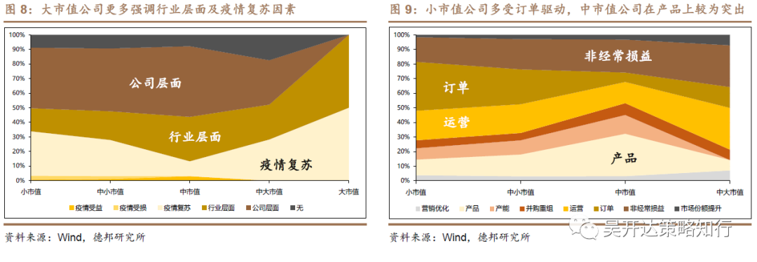 中位数法下看一季报预告增速:已披露业绩预告样本全行业同比增速约115%,较19、18年同期增速分别为51%、62%,和整体法口径交叉验证整体恢复情况良好。较19Q1增速前五行业分别为电子(123%)、综合(114%)、化工(100%)、轻工制造(91%)及国防军工(85%),而休闲服务(-128%)、非银金融(-71%)、房地产(-31%)、纺织服装(-15%)、通信(-13%)、商业贸易(-12%)和传媒(-11%)较19Q1增速为负。通过整体法和中位数法交叉验证:轻工制造、电子、电气设备、国防军工、汽车、钢铁、有色金属、化工、机械设备较19Q1均有较好增长,景气度水平较高;而休闲服务、非银金融、房地产和纺织服装则景气度不及2019年同期水平。3.预告内容看大小:小市值公司多受订单驱动,中市值公司产品因素亮点凸显