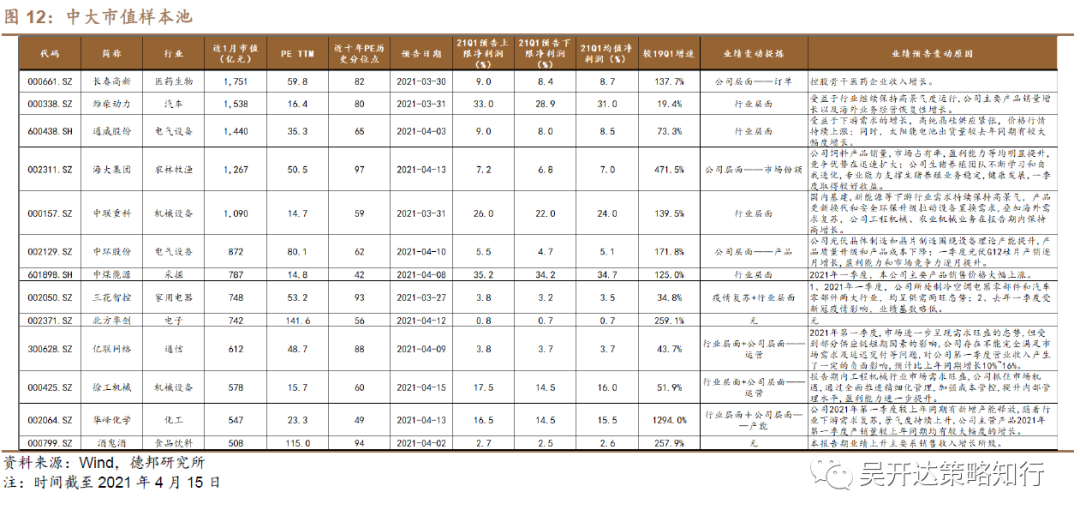 我们对样本内1330+公司业绩预告具体内容进行提炼归因。第一个维度拆分至疫情受益、疫情受损、疫情复苏(顺周期)、行业层面、公司层面和无(无内容或内容无明确导向)六类;第二个维度进一步拆分公司层面因素至产品、产能、订单、营销、运营、市场份额、并购、非经常损益八项。第一个维度来看,疫情相关因素占比均处50%及以下,公司及行业层面因素是业绩预告内容主体。取平均看各因素整体占比,自高到低分别为公司层面33%、疫情复苏29%、行业层面28%、无9%、疫情受益1%、疫情受损1%。从市值大小层面来看,大市值公司更多强调了疫情复苏及行业层面带来的影响,中大市值各项因素分布较为平均,中市值、中小市值和小市值公司则多提及自身。第二个维度来看,订单、非经常损益、运营和产品因素是公司层面解释主体,市场份额和营销优化占比则相对较低。取平均看各因素整体占比,自高到低分别为非经常损益22%、运营21%、订单20%、产品15%、产能8%、并购6%、市场份额4%和营销4%。从市值大小层面来看,小市值及中小市值公司更多强调订单方面的变化,中市值公司则更加提及产品本身,“产品结构调整”、“产品技术优化”成为预告高频词汇,中大市值在运营、非经常损益两方面多有提及。4. 预告内容看行业:顺周期板块主要受行业层面因素驱动,订单在公司层面成为重要解释因素第一个维度来看,疫情相关程度较高行业中:医药生物中部分企业疫情受益,21Q1业绩或存在高基数效应;休闲服务主要为疫情受损,20Q1业绩基期较低;建筑装饰、食品饮料、休闲服务、交通运输、商业贸易等行业主要为疫情复苏(顺周期),21Q1业绩有望在20全年后延续。行业层面影响较大部分中:钢铁、采掘及有色金属系顺周期相关,自疫情复苏以来,下游需求持续旺盛,带动相关产品价格持续上涨。第二个维度来看:综合、非银金融、纺织服装、采掘、农林牧渔、家用电器、计算机及传媒八个行业公司业绩受非经常损益扰动较大(解释占比接近或超过30%),27个行业中仅钢铁行业未受非经常损益影响。国防军工、建筑材料、建筑装饰和钢铁等行业一道受到订单拉动,非银金融、交通运输、商业贸易、房地产、食品饮料及休闲服务行业公司多提及运营,交通运输、传媒、国防军工行业则受一定并购驱动,食品饮料和纺织服装公司发力营销优化,部分汽车、通信行业市场份额提升,公用事业、采掘及化工等行业受产能部分拉动。1)筛选出21Q1净利润已恢复至19Q1水平标的;2)筛选出2016~2019三年Q1单季及全年归母净利润保持增长标的;3)筛选出21 年一致预期业绩增速在20%以上标的;最后,我们根据市值大小,将结构标的池分成三大类,分别为中大市值13家(500亿元-2000亿元)、中市值12家(200亿元-500亿元)和中小市值40家(50亿元-200亿元)。证券研究报告:《德邦证券-策略专题-一季报优质标的挖掘——深挖财报之一季度业绩预告分析20210416》适当性说明