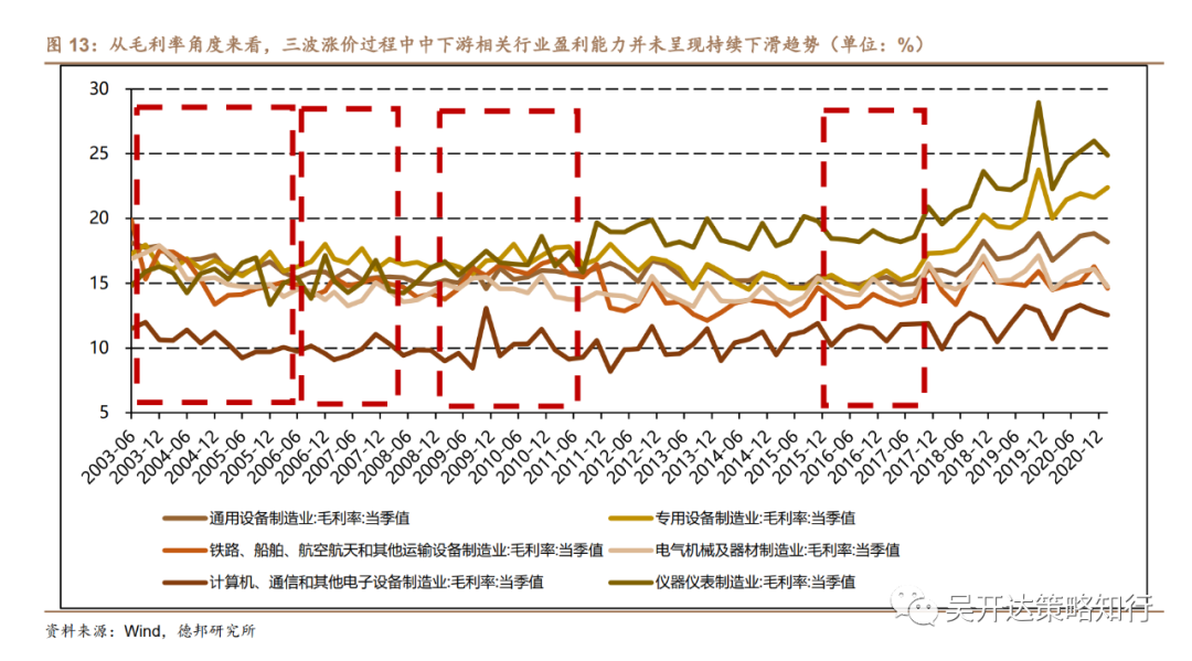 我们前期报告复盘上市公司盈利情况得出“大宗价格上行无法传导至下游大概率是阶段性现象,并不会持续损害上市公司整体利润”。我们进一步研究2003年7月后三波钢、铝、铜三大原材料上涨阶段中下游企业利润端变化,以为近期市场对中下游企业利润受挤压幅度提供参考。虽然2003年7月~2008年5月三类大宗商品现货处于上涨区间,但螺纹钢较后二者有明显滞后,因此分两阶段观察:2003年7月至2006年5月,铜(+333%)、铝(+51%)处于主升区间,螺纹钢(+1%)区间震荡;2006年6月至2008年4月,铜(-14%)、铝(-15%)高位震荡回落,而螺纹钢(+58%)进入主升区间。2008年12月—~2011年7月,金融危机后顺周期中钢(+33%)、铝(+62%)、铜(+164%)三大原材料同步上涨。2016年1月~2017年10月,供给侧改革中钢(+84%)、铝(+53%)价格大幅反弹,铜(+52%)现货价格同步上涨。