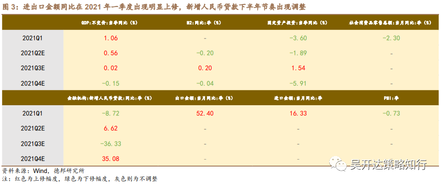 量层面,进出口金额同比在2021年一季度出现明显上修,出口金额同比实际发生值较此前预期上修50%+,好于此前预期。而社会消费品零售总额同比和PMI 指标21Q1实际值低于预期,GDP和固定资产投资同比两指标在不同季节间出现分化,其中GDP指标在2021上半年出现同比上修,固定资产投资指标则在同期出现下修,M2同比预测值则未发生明显改变,新增人民币贷款同比在21下半年出现节奏调整,Q3大幅下修,Q4大幅上修。