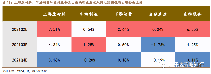 较此前预测情况来看,上游原材料板块全年累计净利润增速预测值上修24.26%,中游制造板块上修4.79%,下游消费板块下修4.95%,金融房建板块上修1.81%,支持服务板块则下修超10%。