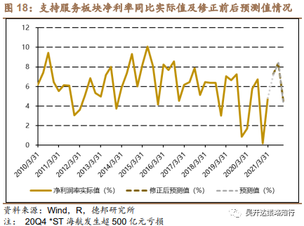 较此前预测情况来看,除金融房建板块外,各板块净利率预测值均较此前预测值发生不同程度调整,其中上游原材料和中游制造板块最大调整幅度(绝对值)均出现于2021年Q3,净利率分别上修0.63%和0.32%,而下游消费和支持服务板块最大调整幅度则出现于2021年Q2。此外,上中下游板块净利率预测值在2021下半年全面上修,支持服务板块净利率预测值则在2021年Q2和Q4上修,Q3下修,但整体变动较小。