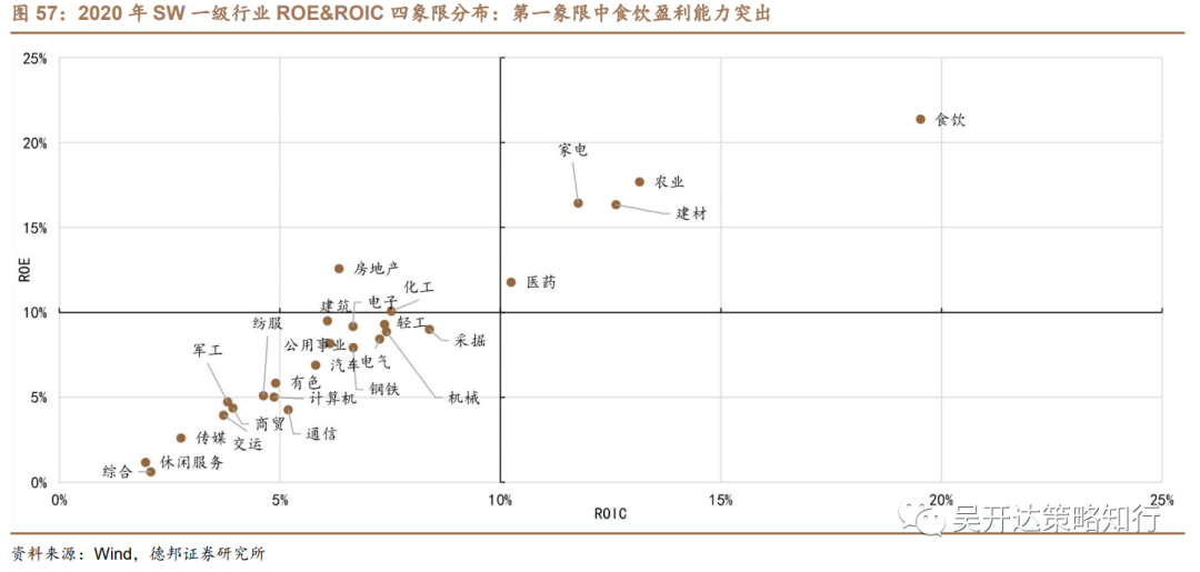 根据2020年行业的ROE及ROIC分布情况,行业多数集中分布在第四象限(ROE、ROIC均低于10%)。第一象限行业中,食饮的ROIC及ROE水平均领先市场,盈利能力突出,其次,家电、农业、建材、医药伴随较高的ROE,ROIC均达到10%以上;第三象限为房地产行业,行业有息负债率较高带动ROE水平保持高位。