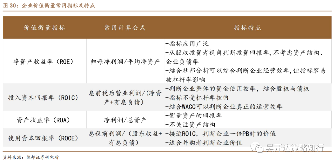 ROE及ROIC指标反应企业价值各有优劣。衡量企业价值的常用指标包括ROIC、ROE、ROA、ROI、ROCE等,其中,ROE最受股权投资者关注,计算简洁、分歧小;ROIC反应企业的价值创造能力最为全面、真实,结合资产结构判断企业的投资效率,指标分析更为客观,但指标计算方式较多,涉及调整项较为复杂。