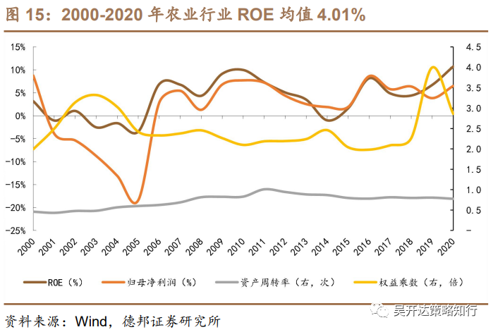 下游消费板块整体杠杆率水平较低,ROE与ROIC差值较低。农业2020年ROE快速增长主要来自产品价格上涨带动的利润率提升,同期投入资本同比增长64%,增速高于NOPLAT,导致2020年农业ROIC微幅下降。