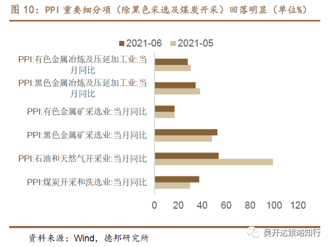 PPI的同比回落,主要受到6月份以来一系列“保供稳价”政策的持续影响,全球走向复苏高点以及翘尾效应的褪去也是重要原因。细分行业中,价格涨幅回落明显的有石油和天然气开采业,黑色金属冶炼和压延加工业以及有色金属冶炼和压延加工业。向前展望,我们认为供给的刚性以及跨周期调节的开启大概率使得大宗商品高位震荡。市场一致预期的通胀冲击一次性并随后回落若落空将成为潜在的最大风险。