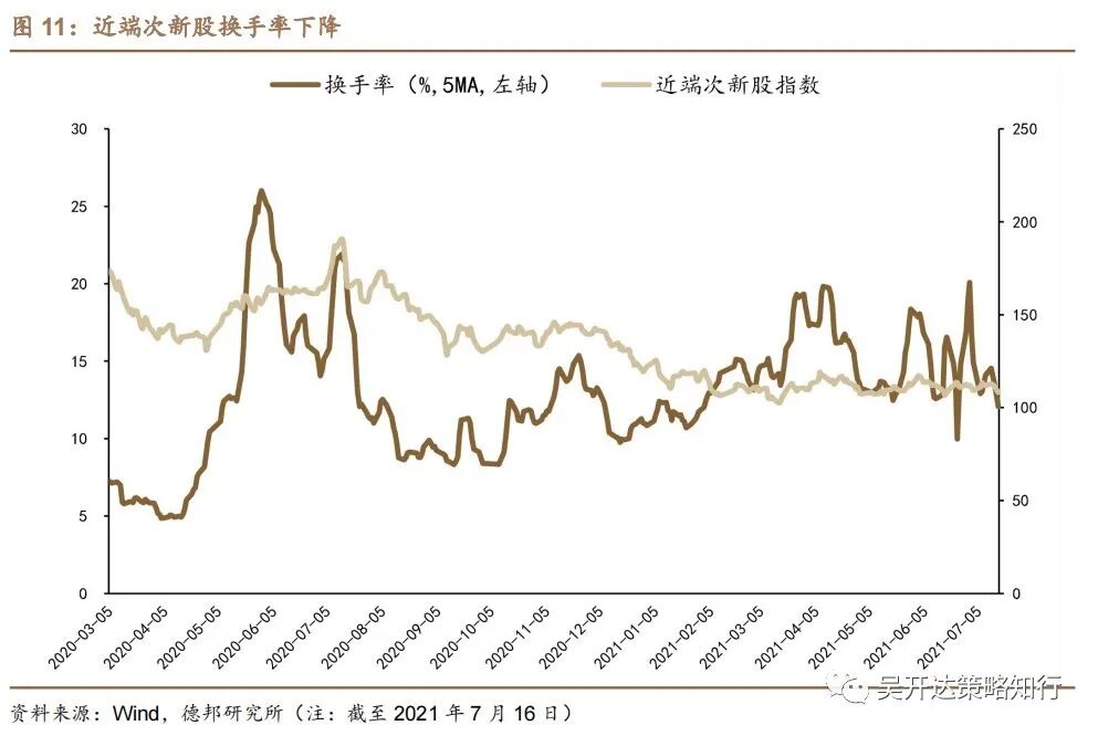 本周近端次新股指数交易热度下降。截至2021年7月16日,近端次新股换手率为12.1%(5MA),处于2020年1月1日以来43%分位水平,较上周减少2.1pct。