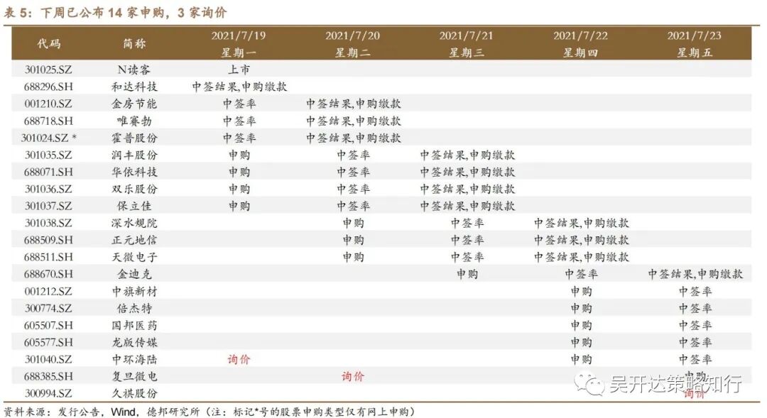 下周已公布3只注册制新股参与初步询价,关注复旦微电。(1)下周已公布3家参与初步询价。初步询价时间安排:7月19日,中环海陆(301040.SZ);7月20日,复旦微电(688385.SH);7月23日,久祺股份(300994.SZ)。(2)注册生效待发行42家。截至2021年7月16日,注册制新股处于已受理至注册生效状态660家,其中已受理155家,已问询304家,上市委会议通过42家,提交注册117家,注册生效待发行42家,此外有12家处于中止审查状态。