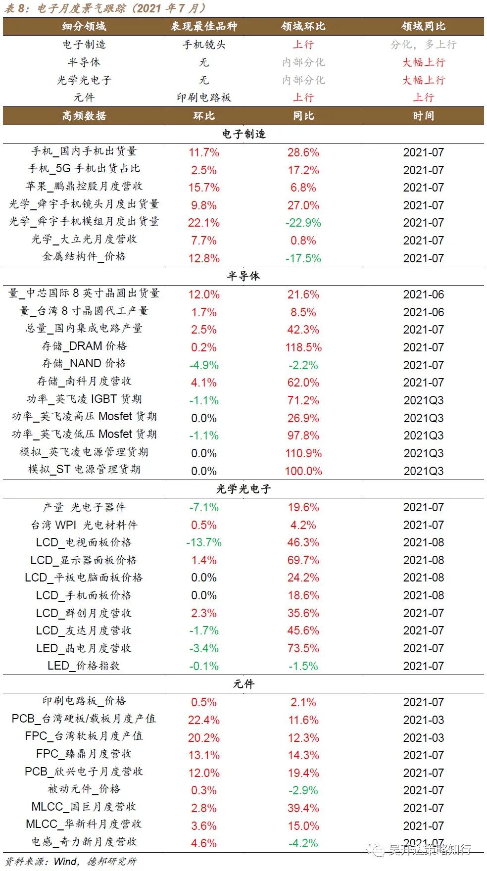 2021年7月,电子制造方面,国内手机出货量环比增长11.7%,较去年同期增长28.6%,5G手机出货占比较上月提升2.5%;鹏鼎控股月度营收环比增长15.7%,同比增长6.8%;舜宇光学月度出货数据环比纷纷上涨,其手机镜头与手机模组月度出货量环比增幅分别为9.8%、22.1%;金属结构件价格则较前月有12.8%的提升;领域环比景气度上行。半导体方面,中芯国际8英寸晶圆出量环比增长12.0%,同比增长21.6%;国内集成电路产量和台湾8寸晶圆代工产量环比均实现小幅增长;NAND价格与上月相比下滑4.9%,DRAM价格基本与上月持平,但同比增幅达118%+;功率领域英飞凌IGBT与低压Mosfet平均货期较上季缩短1.1%,但同比均延长70%+,高压Mos平均货期环比持平;模拟领域电源管理平均货期环比持平,英飞凌环同比均延长110.9%;领域环比景气度内部分化。光学光电子方面,光电子器件产量同比下滑7.1%,但同比仍有19.6%增长;LCD面板继续小幅上涨,显示器面板价格环比涨1.4%,其余价格与上月持平,LED相关价格指数环比微幅下跌0.1%;群创月度营收环比提升2.3%,同比增长35.6%,其余月度营收环比小幅下降,但同比仍然上涨;领域环比景气度内部分化。元件方面,印刷电路板价格环比微幅上涨0.5%;臻鼎、欣兴月度营收分别环比增长13.1、12.0%;被动元件台湾价格指数环比微幅增长0.3%,国巨、华新科月度营收环比分别增长2.8%、3.6%,奇力新环比增长4.6%;领域环比景气度上行。