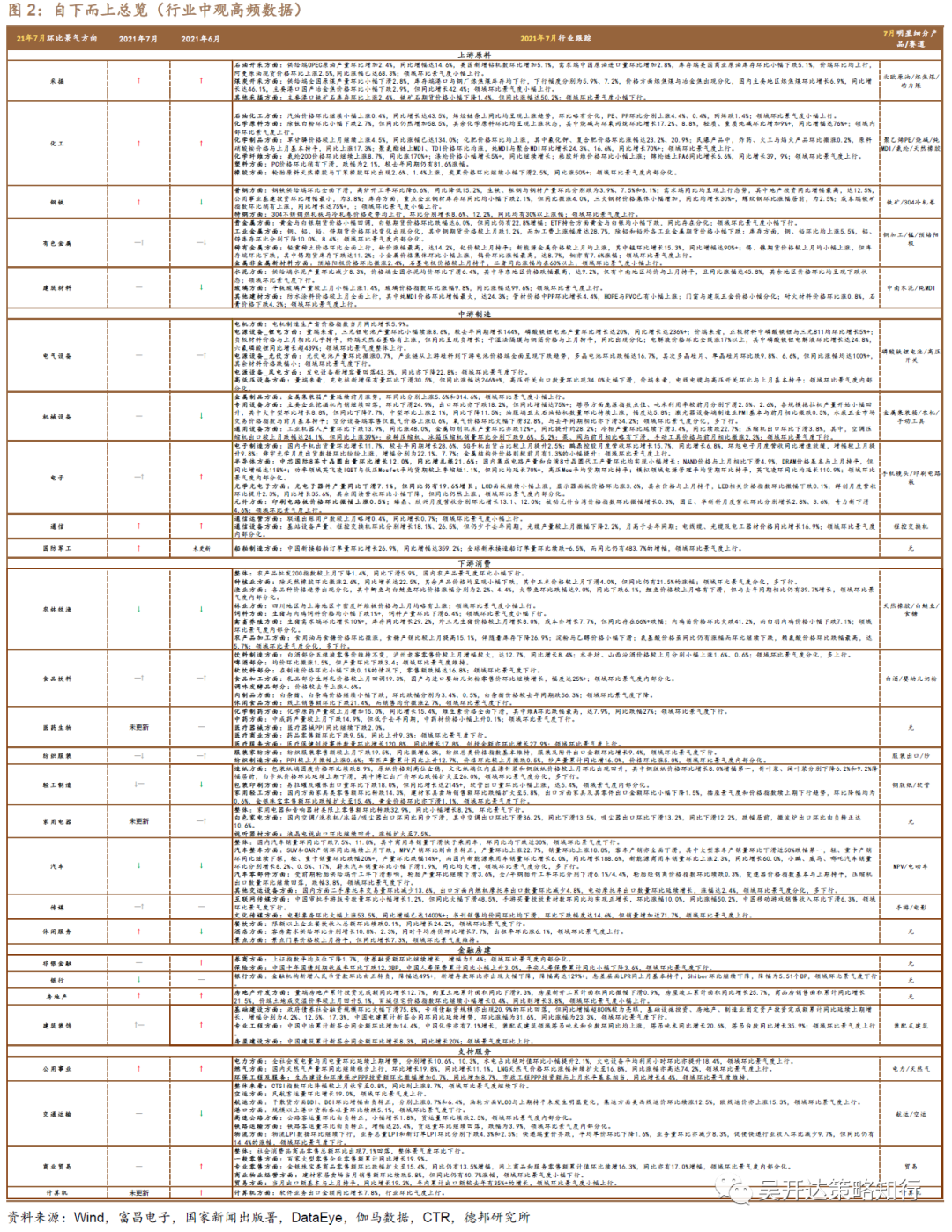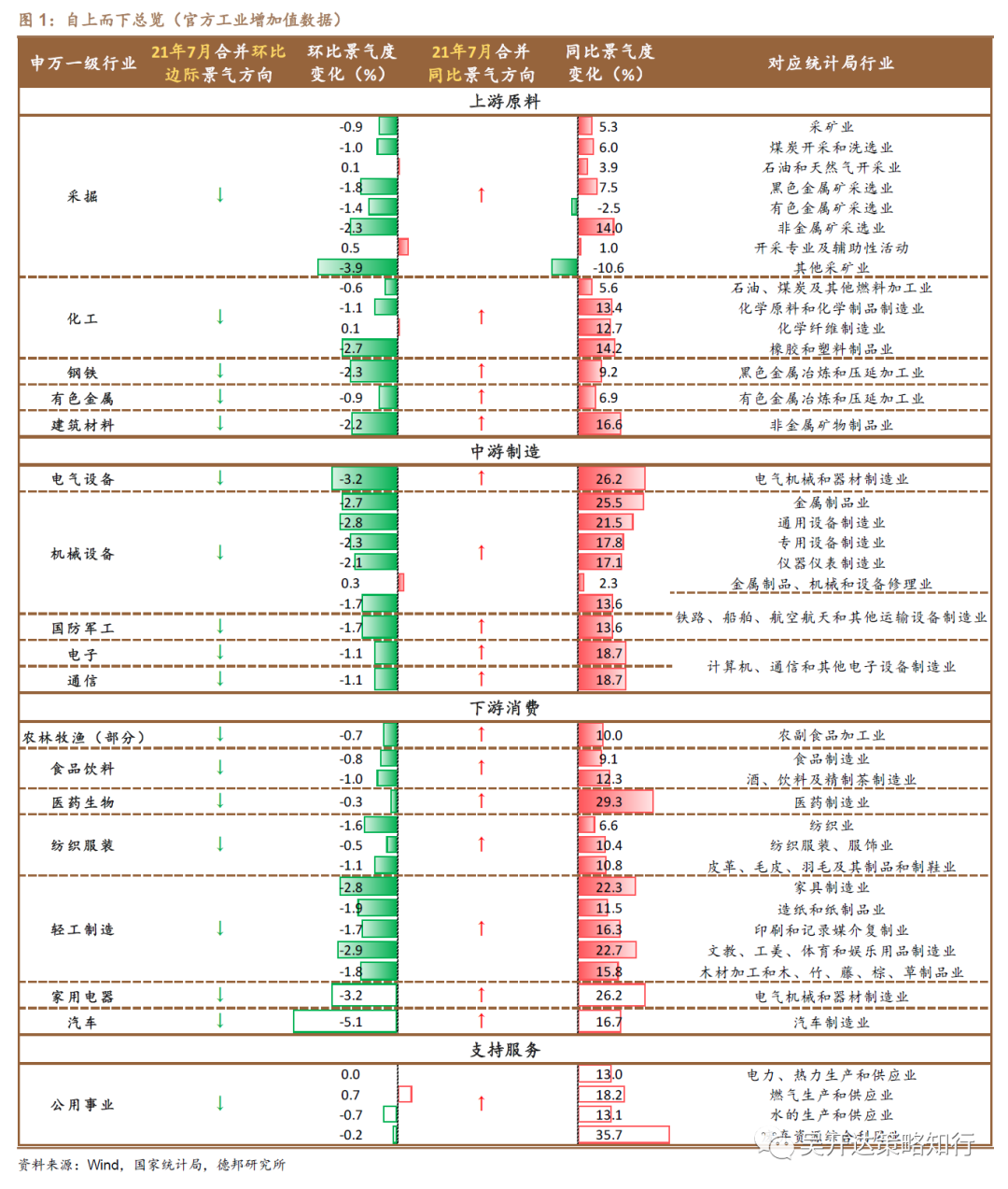 下游消费:2021年7月,农林牧渔行业总体环/同比景气度小幅下行,仅林业环/同比景气度均上行,种植业、渔业、禽畜养殖和农产品加工环比景气度分化,饲料环比景气度小幅下行,同比上行,农产品加工景气度环/同比均分化;食品饮料行业饮料制造环比景气度分化,同比景气度上行,食品加工环/同比景气度均分化;医药生物行业医药商业环比景气度下行,同比景气度上行,医疗服务环比上行、同比量价分化;纺织服装行业服装家纺环比景气度下行,同比景气度上行,纺织制造环比景气度分化而同比上行;轻工制造行业造纸及包装印刷环比景气度分化、同比上行,家用轻工环比景气下行,同比分化;家用电器行业整体景气度环比下行,同比上行;汽车方面总体环/同比景气度均下行,汽车整车及其他交运设备环比景气度分化,汽车零部件环比景气度下行,同比分化;传媒行业文化传媒环/同比景气度均上行,互联网传媒环比景气度下行,同比上行;休闲服务方面,餐饮环比景气度下行,酒店上行,景点维持,同比则均上行。