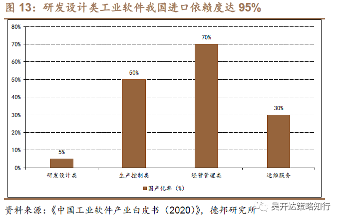 国内工业互联网加速渗透需求与关键工业软件“卡脖子”间的矛盾逐步浮现,大力推动自主可控工业软件推广应用已上升至国家级战略高度。随着我国工控自动化行业规模迅速提升,国内工业软件产业规模增速近三年维持10%+,大幅领先全球规模增速。但从细分领域来看,我国仅经营管理类软件上实现了70%的国产化率,且高端化市场仍由SAP、Oracle主导,领域内国产代表性公司与SAP合作停止后业绩亦较为挣扎;生产控制类国产化率达到50%,涌现了上海宝信、和利时、浙大中控等行业领军企业,但在高端市场中还不占优势;运维服务进口依赖度达70%,国内缺少成熟工程应用,缺乏数据和经验积累;以CAD为代表的研发设计类进口依赖度高达95%,国内劣势依然较大,面临“卡脖子”问题。2021年2月,工业软件首次入选科技部国家重点研发计划首批重点专项,上升至国家级战略部署高度,同月,习近平总书记发表重要讲话强调要加快攻克重要领域“卡脖子”技术,国产工业软件企业有望持续受益于政策突破技术难关,最终乘工业互联网东风实现高速增长。