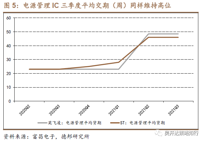 供给端持续受压,三季度电源管理IC和功率半导体交期维持高位。电源管理IC为半导体中最紧缺环节,二季度英飞凌电源管理IC平均交期为41周,较一季度延长18周,ST电源管理IC平均交期为35周,较一季度延长13周,三季度紧供给状态维持,货期保持高位,电源管理IC相关设计公司业绩有望迎来爆发。功率半导体方面,企业订单交期亦排至22Q1/22Q2,二季度英飞凌IGBT平均交期维持在31周高位,低压MOS交期则延长至39周,三季度受交期维持高位影响“涨声渐起”。