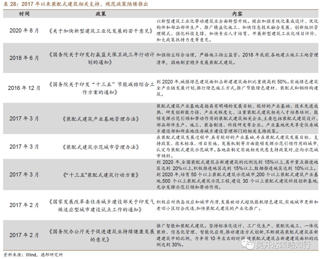 在“碳中和”等环保政策催化下,低劳动力需求、低能耗、低污染的环保绿色装配式建筑为建筑行业转型趋势。1)2016年至今,国家陆续推进装配式建筑政策,2020年9月最新出台的《关于加快新型建筑工业化发展的若干意见》指出,发展新型建筑工业化是城乡建设领域绿色发展、低碳循环发展的主要举措,2020年装配式建筑面积占新建建筑面积仅20%,结合碳中和大背景下,装配式建筑未来行业空间广阔。2)目前我国人口出生率走低,农民工老龄化严重,劳动力不足导致人工成本提升,装配式建筑能有效缩短工期,降低对劳动力需求,是建筑行业发展的必然趋势。3)根据《中国建筑能耗研究报告(2020)》,2018年全国建筑全过程能耗总量占全国能源消费比重为46.5%,碳排放量占碳排放总量比重超过51.3%,相比于传统建造工艺,装配式建筑拥有低能耗、低碳排放的特点,更符合绿色发展理念。