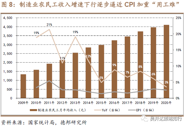 工控自动化行业高景气背后的核心驱动因素是人口红利边际下行所导致的制造业“用工难”。我国制造业农民工人数在2008~2012年间依然维持上升趋势,制造业民工占整体水平在36%~37%,但2012年随着平均收入增速下降至11%,随即2013年制造业农民工占比陡然降至31%。2013~2020年制造业农民工数量开启下行趋势,而月平均收入增速中枢下移亦降低了农民工在制造业的就业意愿,制造业企业面临人力成本上行以及“用工难”双重压力,在此大背景下工控自动化成为了制造业企业走出双重压力的最优方案。