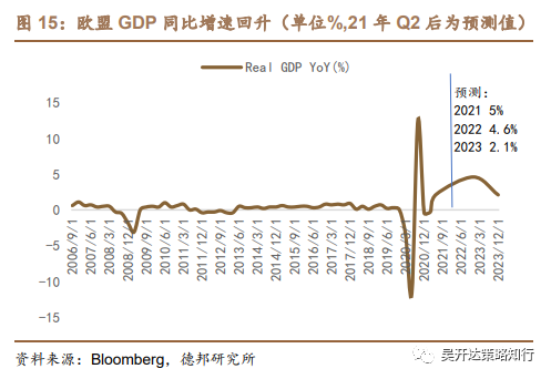 我们认为放缓PEPP购买规模不代表紧缩,因为即使退出了PEPP,欧央行仍有每月200亿欧元的APP来支撑经济,且持续至下次加息前。与美联储相似,欧央行做出未来的货币决策会更加关注经济复苏和就业情况,我们预期欧央行PEPP紧急购债可能从800-900亿元下调至600-700亿欧元,PEPP应该会至少持续至明年3月,并在今年年底或明年年初讨论结束PEPP的时点和节奏。由于欧洲整体经济复苏滞后于美国,我们预计欧央行货币正常化的时点会滞后于美联储。