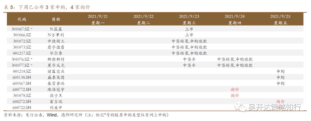 下周已公布4家参与初步询价。初步询价时间安排:9月24日,珠海冠宇(688772.SH)、孩子王(301078.SZ);9月25日,富吉瑞(688272.SH)、同益中(688722.SH)。