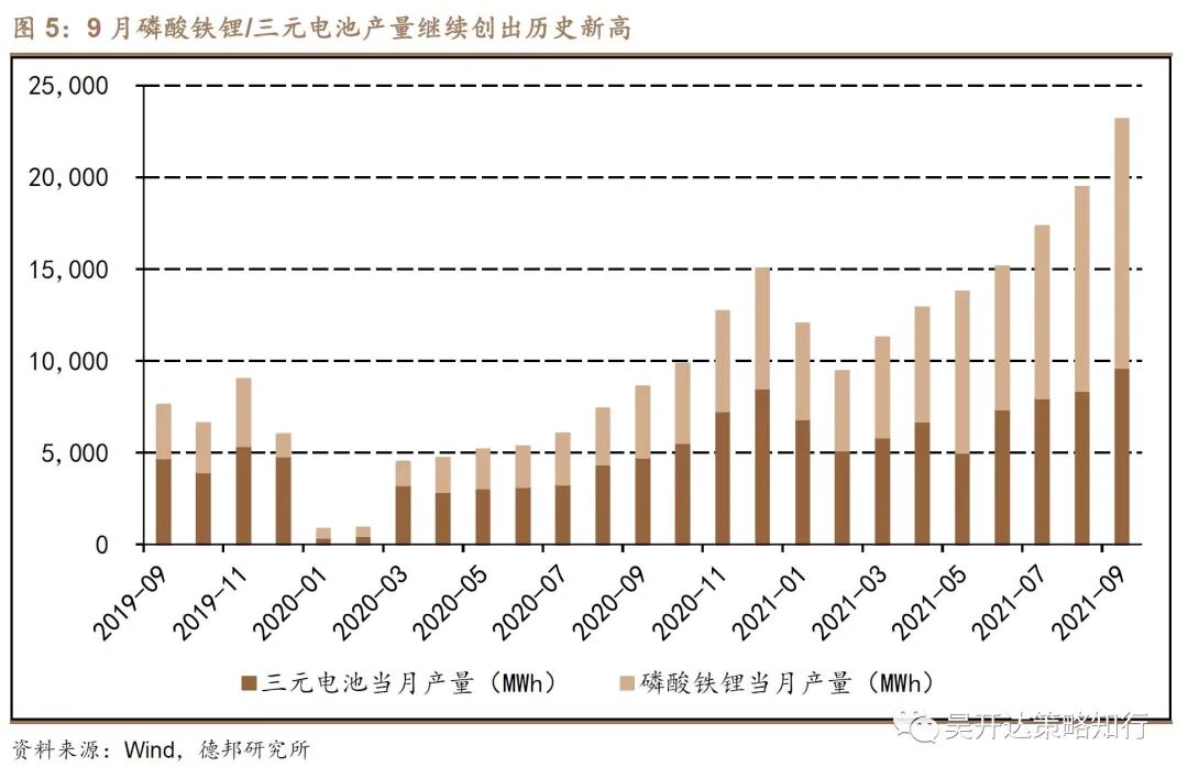 新能源整车需求释放有望带动锂电池产量同步向上。9月磷酸铁锂、三元电池产量继续刷新历史新高,其中磷酸铁锂电池产量达13514.1MWh,环比增速达21.9%,三元电池产量达9630.2MWh,环比增速15.1%。