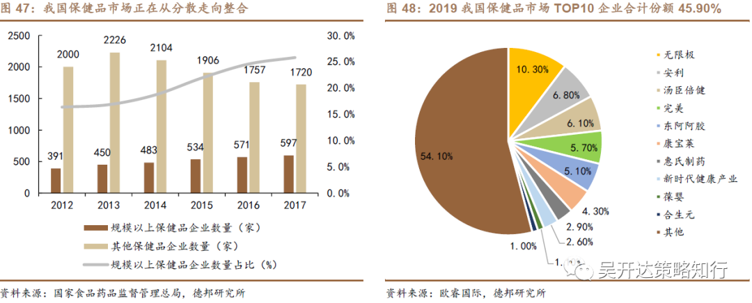 我国保健品规模以上企业数量增加,监管推动市场份额向龙头企业集中。由于过往我国保健品市场的监管体系不健全、产业链上利润分配不合理,市场竞争格局较为分散。2012年我国共有保健品企业2391家,其中规模以上保健品企业仅为391家,其他保健品企业2000家,规模分布不均。近年来由于我国出台了一系列政策加强了行业监管,市场机制的改善推动保健品市场由分散走向整合,大规模保健品企业占比逐渐增高,龙头企业逐渐显现,2017年规模以上保健品企业增加至597家,相较2012年增加52.69%,市场向头部企业集中趋势显现。