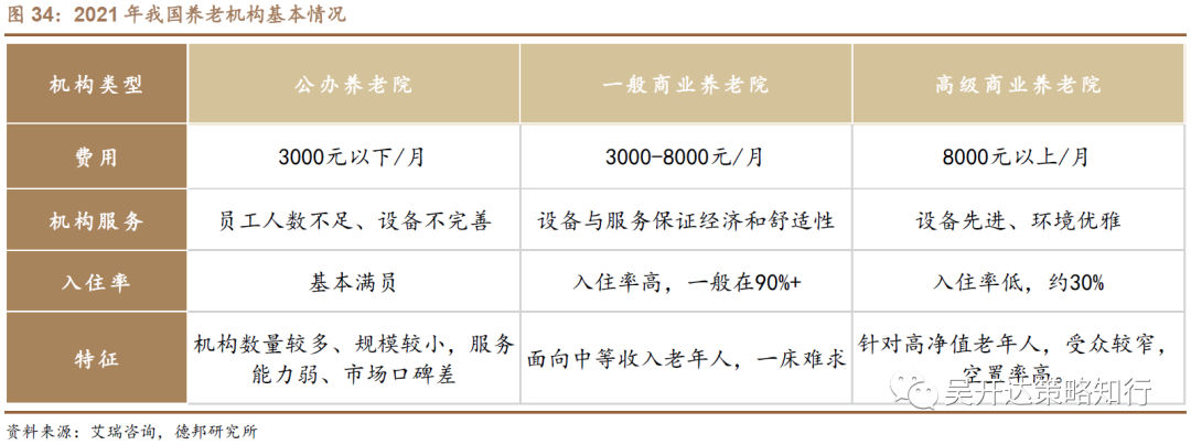由于养老机构数量不足,养老资源分配不均等原因,居家养老为主,社区和机构养老为辅成为目前社会现状。在老龄化加深、养老服务需求迫切的现状下,我国养老服务机构数量不升反降,2013年为4.16万家,到2019年仅剩3.41万家,入住率整体下滑。同时,每千名老人养老床位数自2015年起便波动下降,未见好转。由于目前地产模式下的养老机构,聚焦高净值老年人,主要分布在一线城市,高端机构的床位入住率较低;而具有公益属性的护理院、及一般的商业养老院等机构则受制于利润微薄、服务能力较差、医疗嵌套度低、硬件投入不足等问题,同时出现“一床难求”的供不应求问题,以及利润微薄导致的机构数量下降