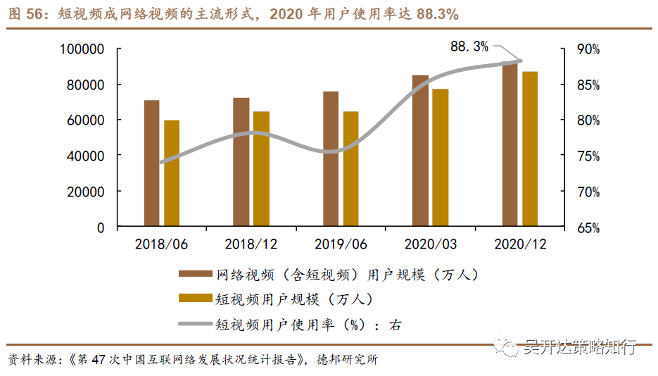 短视频平台受众群体扩大至老龄人口。由于短视频的可读性、趣味性、可参与性高、受众面广等特点,这一娱乐模式极大地吸引了多个年龄段群体,其中老年人受益于该类平台操作简便的优势,迅速成为短视频的忠实用户。根据《第47次中国互联网络发展状况统计报告》,截至2020年12月,我国网络视频(含短视频)用户规模达9.27亿,较2020年3月增长7633万,占网民整体的93.7%。其中短视频用户规模为8.73亿,较2020年3月增长1亿,占网民整体的88.3%。根据巨量算数《2021中国新锐品牌发展报告》,网络视频(含短视频)、短视频、网络直播等与消费场景强相关的互联网应用增长均超过10%,短视频的网民使用渗透率已接近九成,网络直播的网民渗透率也超过了六成。而从使用时长看,截至2020年6月,网络视频、短视频、网络直播三类应用使用时长已占全部应用的30%。从用户规模与渗透率来看,短视频已占据大部分市场份额且仍有未释放潜力。